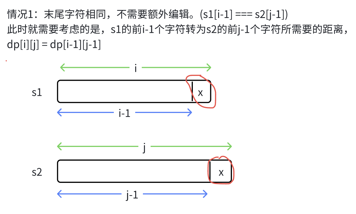 情况1:末尾字符相同(s1[i-1] === s2[j-1]),dp[i][j] = dp[i-1][j-1]