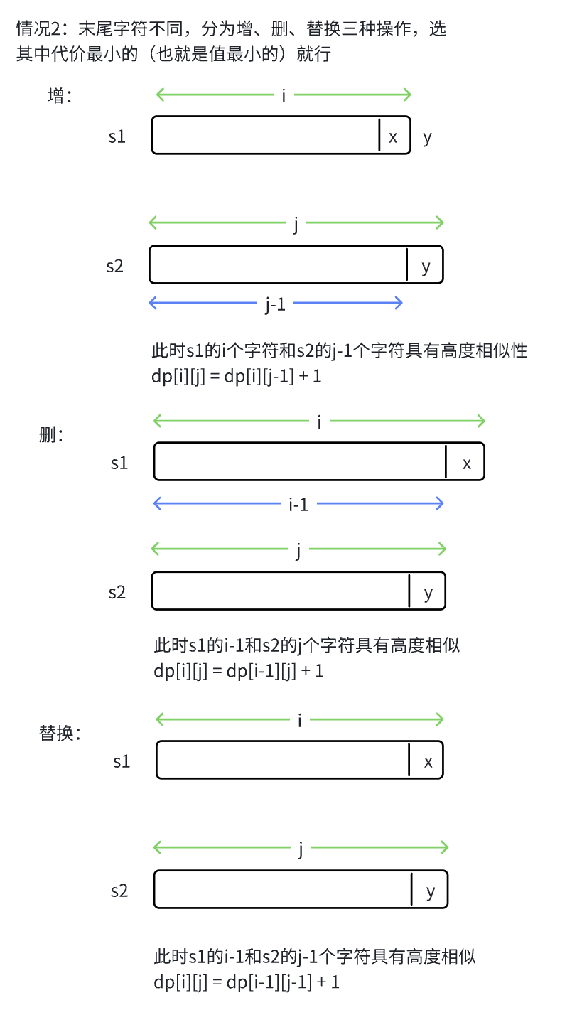 情况2:末尾字符不同,此时又分为3种情况,分别是增、删、替换操作