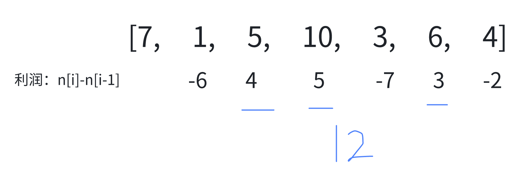 解释:在第 2 天(股票价格 = 1)的时候买入,在第 3 天(股票价格 = 5)的时候卖出, 这笔交易所能获得利润 = 5 - 1 = 4。 随后,在第 4 天(股票价格 = 3)的时候买入,在第 5 天(股票价格 = 6)的时候卖出, 这笔交易所能获得利润 = 6 - 3 = 3。 最大总利润为 4 + 3 = 7 。