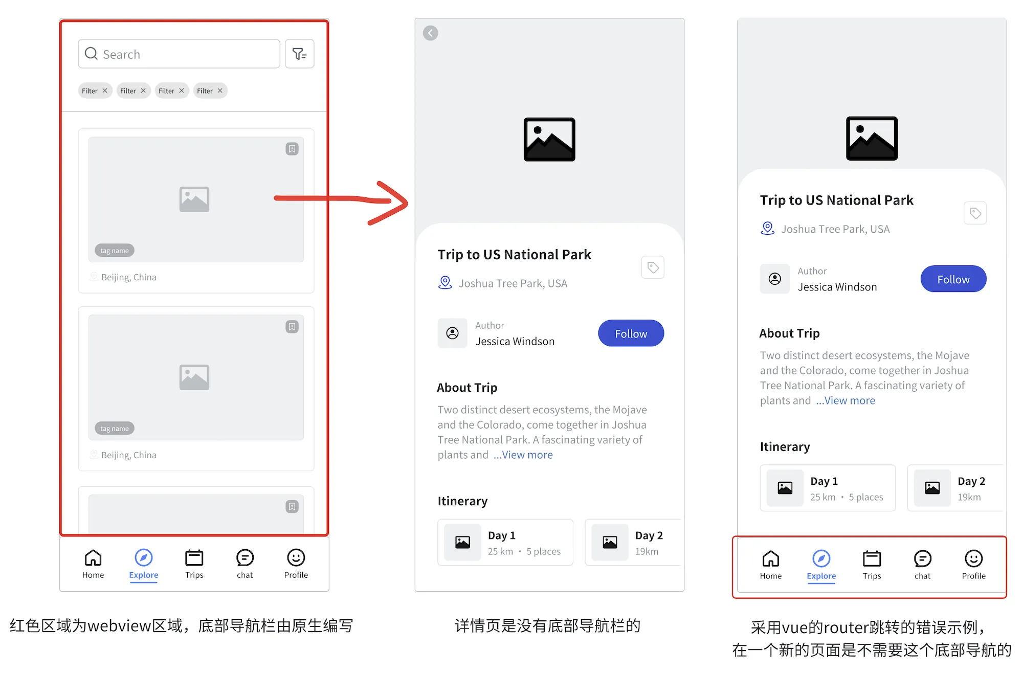 背景:原生使用 webview 嵌套 h5,我的 h5 是 vue 项目,在 app 首页 tab 中,直接把 tab 的整个页面交给 h5 来渲染,因为 tab 页面的列表点击后,需要跳转一个新页面,新页面打开的是一个新的 webview,底部的 tab 不能在详情页出现。我当时使用的是 vue 自带的 vue-router 进行跳转,出现的是由图一到图三的效果,这样导致不够美观,下面来分析原因: